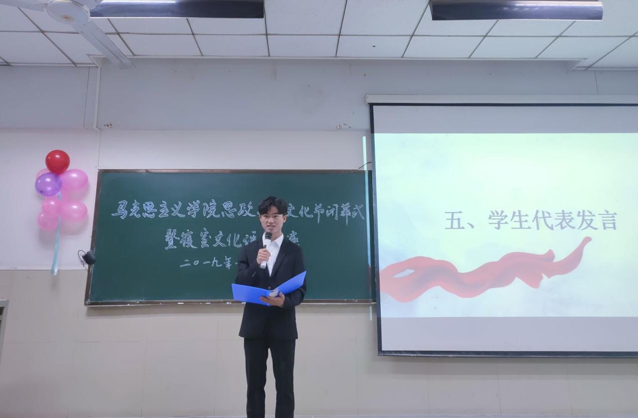 进入思政之音文化节闭幕式,学生代表莫保华回忆了思政之音文化节系列活动,分享了自己在系列活动中的点滴收获与成长,表达了对服务同学,自我成长,建设更好马院的决心。