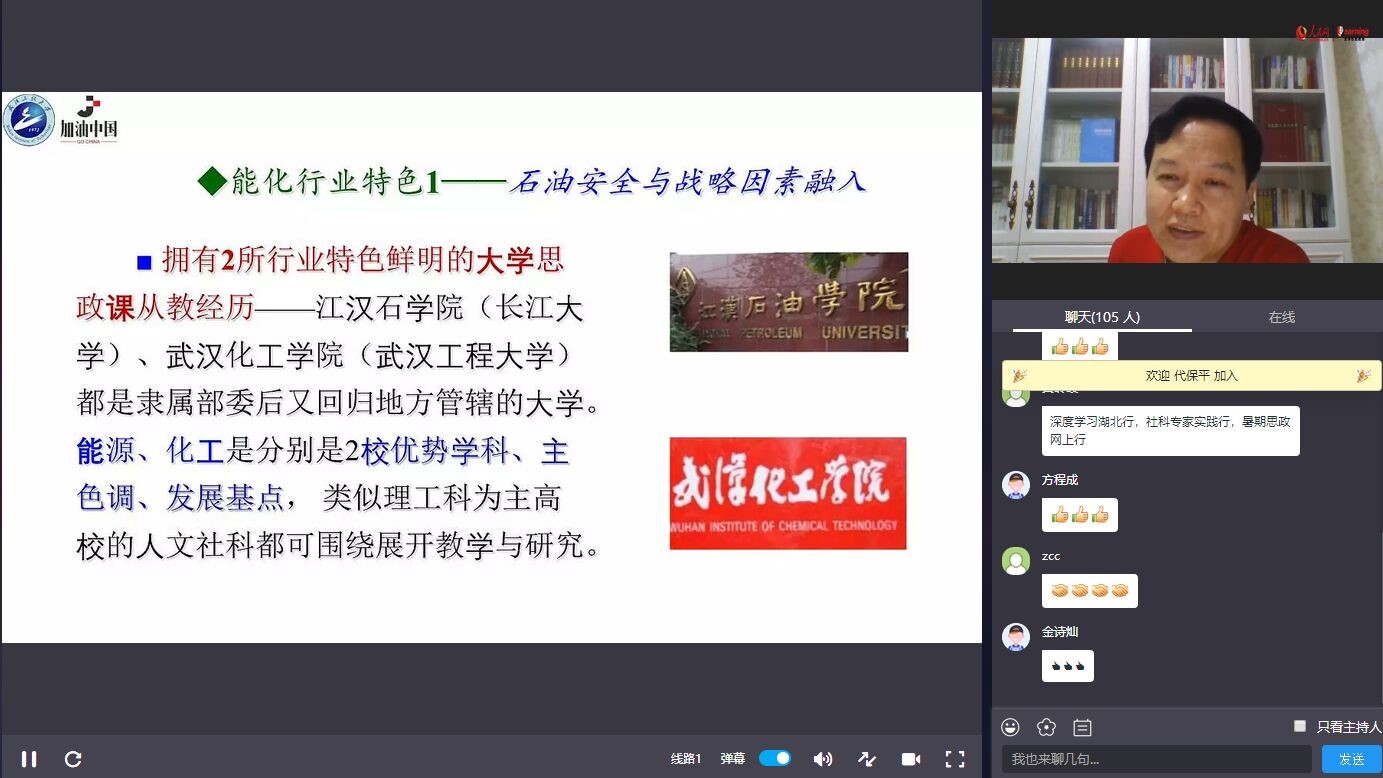 (通讯员 龙晓华)2020年7月4日晚,由vwin德赢AC米兰官网主办 ,人民网公开课协办,华中科技大学vwin德赢AC米兰官网、湖北经济学院vwin德赢AC米兰官网、武汉工程大学vwin德赢AC米兰官网、湖北科技学院vwin德赢AC米兰官网、黄岭峻工作室及文华在线教育六家单位承办的湖北省第二届“新时代高校思政金课建设”研讨与交流周系列活动之湖北高校“中国系列”思政选修课第四次专题讲座以人民网公开课的方式成功举办。本次讲座的主讲人为武汉工程大学vwin德赢AC米兰官网党委书记、国家精品视频公开课《谁来给中国“加油”——中国石油安全的困境与出路》主讲人、“加油中国”课程负责人舒先林教授,讲座主题为“如何将行业特色融入思政课?——以武汉工程大学‘加油中国’为例”。