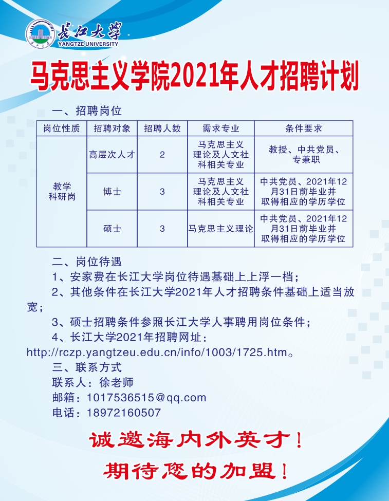 硕士招聘条件参照长江大学人事聘用岗位条件;