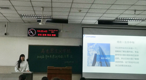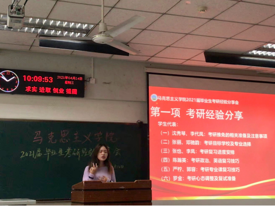 会上,10位拟录取的考研学生代表分别就自身经历重点突出地介绍了考研心得。其中,沈秀琴和李代凤两位同学就考研推免的相关流程及注意事项进行了分享,特别提醒同学们多报考几个学校的夏令营,为后面升学提供更多选择。张丽和邓驰韵两位同学分享了自己考研的目标学校及专业选择的方法,指出专业和学校的选择要充分结合个人喜好、学校上岸率和未来的人生规划。张也和李凤同学分别就专业课和公共课分享了自己的考研复习进度安排,指出边背诵边划重点的方法非常适用。陈瀚英同学细致地讲解了自己考研备考政治、英语的复习技巧,为同学们提供了非常可贵的参考建议。严柠和郭容两位同学就考研专业课复习技巧进行了分享,特别强调一定要坚持自己的复习计划,认真利用真题。罗金同学则就考研过程中的心态调整及复试准备的技巧涉及的内容进行了细致的阐述,幽默风趣的语言,真诚的备考故事让同学们受益匪浅。