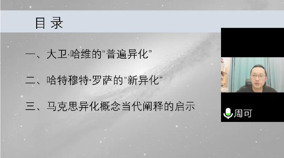 在讲座中,周可博士主要围绕大卫·哈维的“普遍异化”、哈特穆特·罗萨的“新异化”、马克思异化概念当代阐释的启示这三个问题展开分析。第一个问题是异化概念复兴的理论基础,针对这个问题,他从异化概念复兴的社会表现形式入手进行剖析,从科技加速到社会变迁加速再到生活步调加速等,展开了全方位的说明。关于第二个问题,他主要围绕晚期现代社会的异化形式进行功能批判和规范批判,分享了超越异化的共鸣关系的三个面向:社会、物质、存有。在谈到第三个问题时,他提出要实现社会批判理论与社会科学的融合、寻求替代资本主义的总体方案。