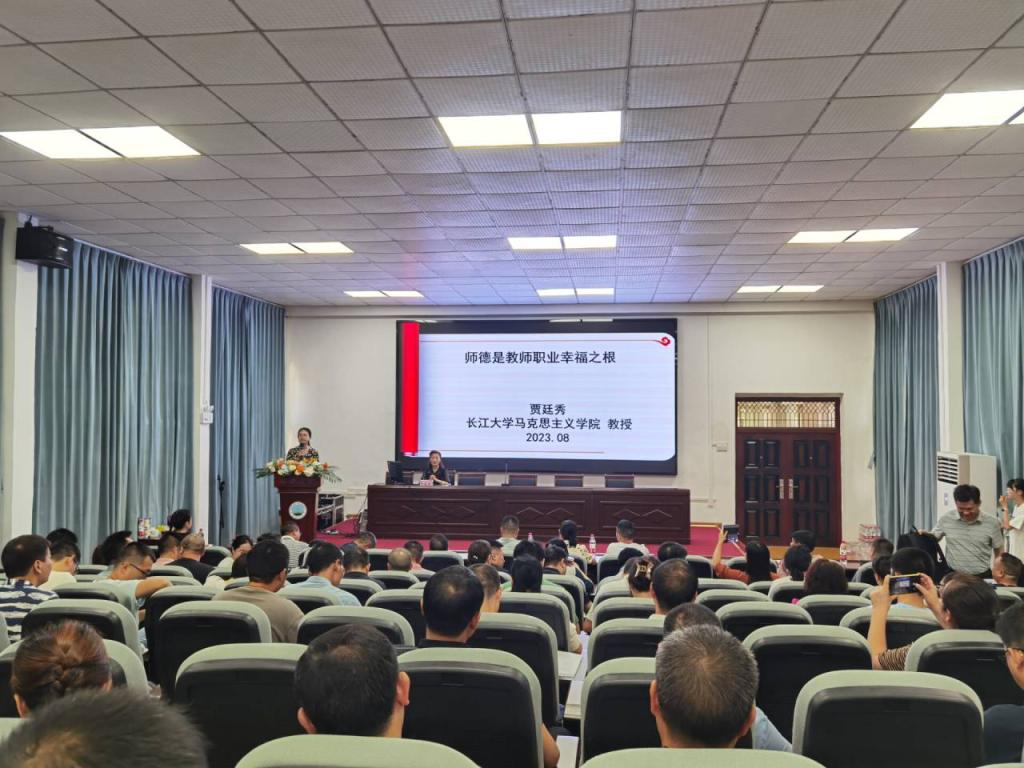 8月12日上午,2023年“国培计划”荆州市中小学党组织书记研修班在国际教育学院报告厅进行。vwin德赢AC米兰官网教授、研究生导师贾廷秀围绕习近平总书记关于师风师德建设的重要论述进行授课,贾教授将授课内容分为中小学教师职业幸福感概述和叩响教师职业幸福大门上下两篇,又从幸福是人类追求的美好样态、中小学教师职业幸福感的发展态势和中小学教师职业幸福感面临挑战三个方面对中小学教师职业幸福感进行解读,再结合习近平总书记提出的“四有好老师”标准,提出了做有理想信念、力行师道的好老师,做有道德情操、以身立教的好老师,做有扎实学识、精于师术的好老师,做有仁爱之心、彰显师魂的好老师。