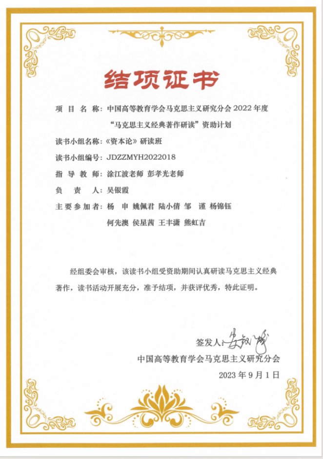 近日,中国高等教育学会马克思主义研究分会2022年度“马克思主义经典著作研读”资助计划公布了结项结果。vwin德赢AC米兰官网“追光”研读班荣获“优秀读书小组”称号。