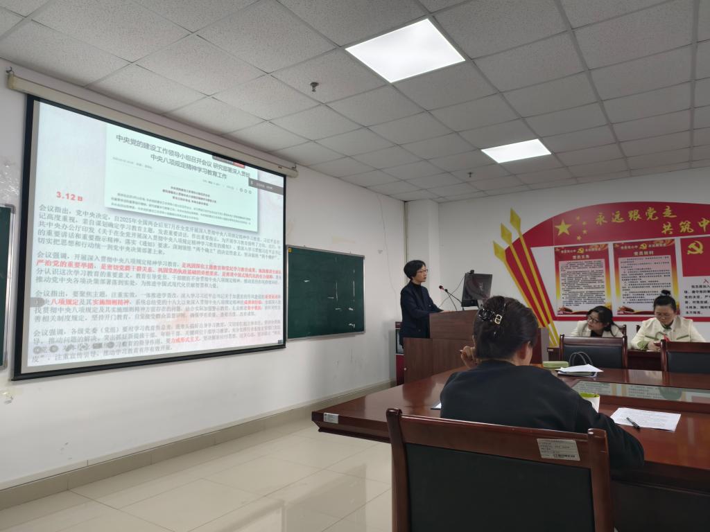 会上,学院党委书记刘小燕领学了习近平总书记关于党政机关习惯过紧日子的重要讲话和重要指示批示精神、习近平总书记关于树立和践行正确政绩观的重要论述、2024年12月9日中共中央政治局会议精神、习近平总书记在中央经济工作会议上的重要讲话精神、习近平总书记考察贵州、云南时的重要讲话精神,传达了第二十八次全国高校党的建设工作会议精神、全国两会精神、2025年全国教育工作会议精神、全省教育大会精神以及第二十八次全省高校党的建设工作会议精神,深入解读了《教育强国建设规划纲要(2024-2035年)》,并就校党委二届六次全体会议、学校2025年工作部署会、校纪委二届五次全会、学校党的建设工作领导小组会议等相关会议精神以及校纪委关于在全校范围内开展《教职工违规打牌和赌博专项整治》、《深入纠治公款旅游问题》等内容进行了集中传达。刘小燕还作了vwin德赢AC米兰官网深入贯彻中央八项规定精神学习教育部署,并讲授了以《作风建设永远在路上——深入贯彻中央八项规定精神学习教育》为题的专题党课。