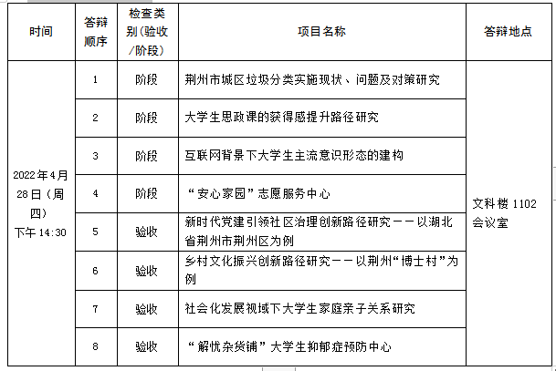 检查答辩分PPT汇报(汇报5分钟)、提问与答辩(5分钟)两个环节进行,汇报内容为:项目研究内容、方法、研究成果、项目的创新性及任务的完成情况等。陈述由1人完成,回答问题或研究感受可以由其他成员补充。