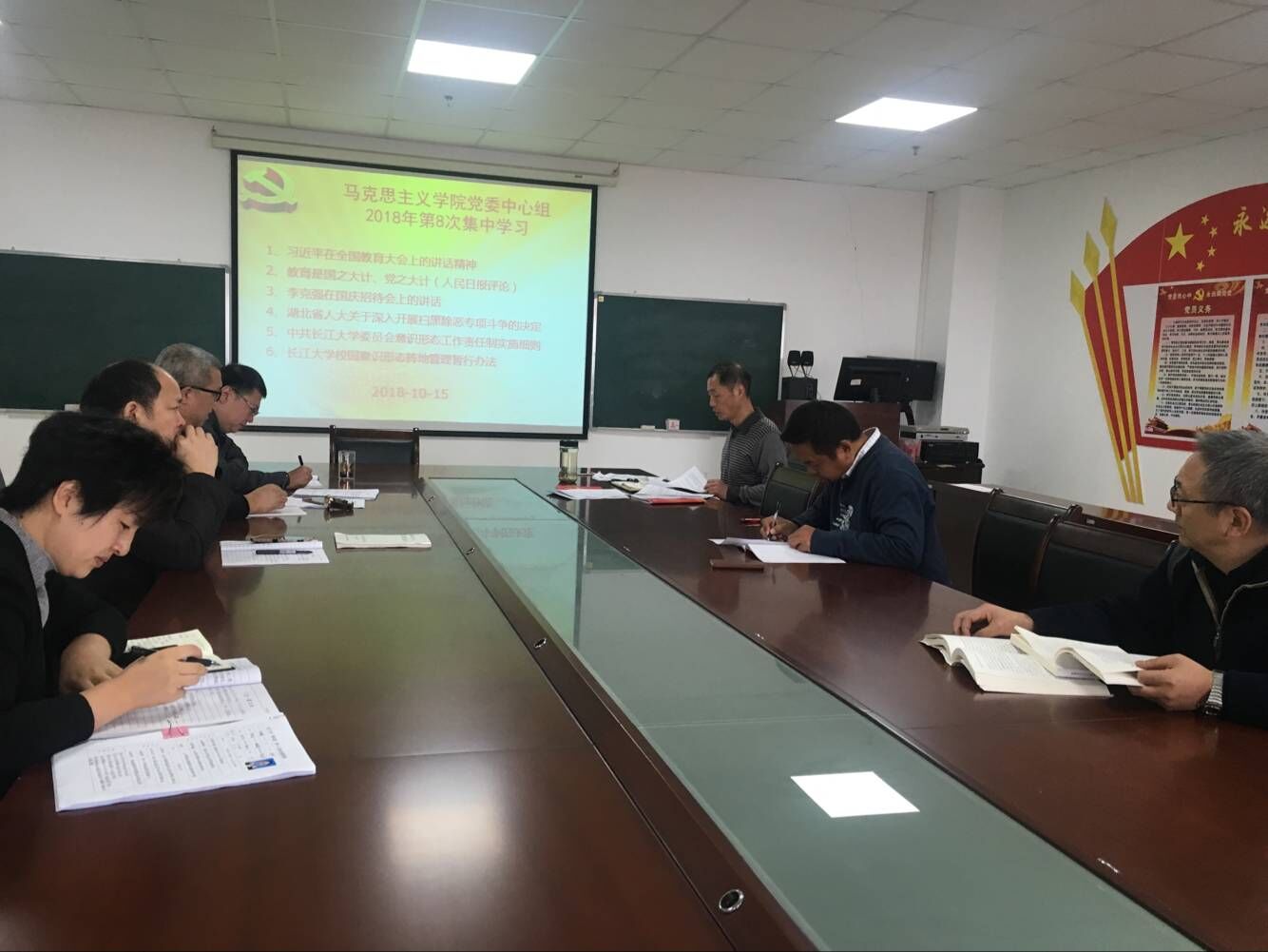 vwin德赢AC米兰官网于2018年10月15日在文科楼1104室举行了党委理论学习中心组第八次集中学习,党委理论中心组成员及各支部书记参加了学习会,会议由党总支书记吴智勇主持。