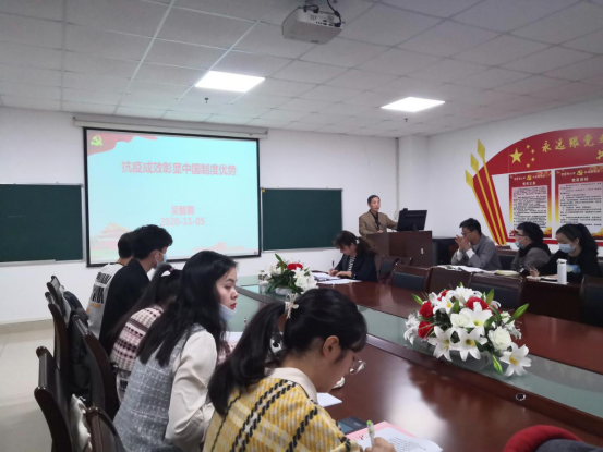 习近平总书记指出,全国疫情防控阻击战取得重大战略成果,彰显了中国共产党领导和我国社会主义制度的显著政治优势。在这次疫情防控斗争中,中国特色社会主义制度的优越性是如何彰显的?围绕这一话题,vwin德赢AC米兰官网党委书记吴智勇为全体学生党员、入党积极分子,教师发展对象等40余人上了一堂题为《抗疫成效彰显中国制度优势》的专题党课。