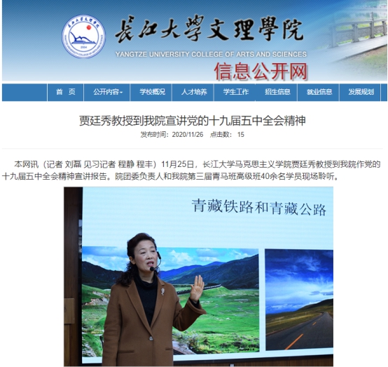 11月5日,学院党委副书记马小佼领学了十九届五中全会公报,全院学生党员、入党积极分子、学习小组成员共同参会;11月8日,学院组织各支部书记参加学校基层党组织书记集中培训,共同聆听了武汉大学项久雨教授所做的《中国道路的未来——十九届五中全会精神解读》;11月10日,学院召开了党委理论中心组集中学习暨党委扩大会,吴智勇书记领学了十九届五中全会精神;11月13日,学院组织开展全院教职工政治学习,全体教师共同学习了全会精神,院长姜学勤为与会人员上了一堂了题为《擎画新蓝图 开启新征程——党的十九届五中全会精神解读》的专题党课;11月12日至11月13日,学院党委书记、院长带头学习了全国教育系统党的十九届五中全会精神宣讲报告会、中央宣讲团成员在湖北高校的宣讲报告;12月3日,校党委书记朱业宏为Vwin德赢唯一官方网站科级以上干部做了十九届五中全会的专题宣讲;12月4日,湖北省委宣讲团成员、武汉纺织大学vwin德赢AC米兰官网院长金艳来校宣讲十九届五中全会精神,全院思政课教师参会;12月10日,荆州市委宣讲团成员、Vwin德赢唯一官方网站涂江波副院长为全院师生宣讲了全会精神。此外,Vwin德赢唯一官方网站贾廷秀、卢军等教师作为荆州市委宣讲团成员,还先后受邀为长江大学文理学院、市科协、市侨联、市工商联、市残联等校内外单位进行了理论宣讲。全院学生也通过“支部主题党日”、主题团会等形式开展了专题学习。