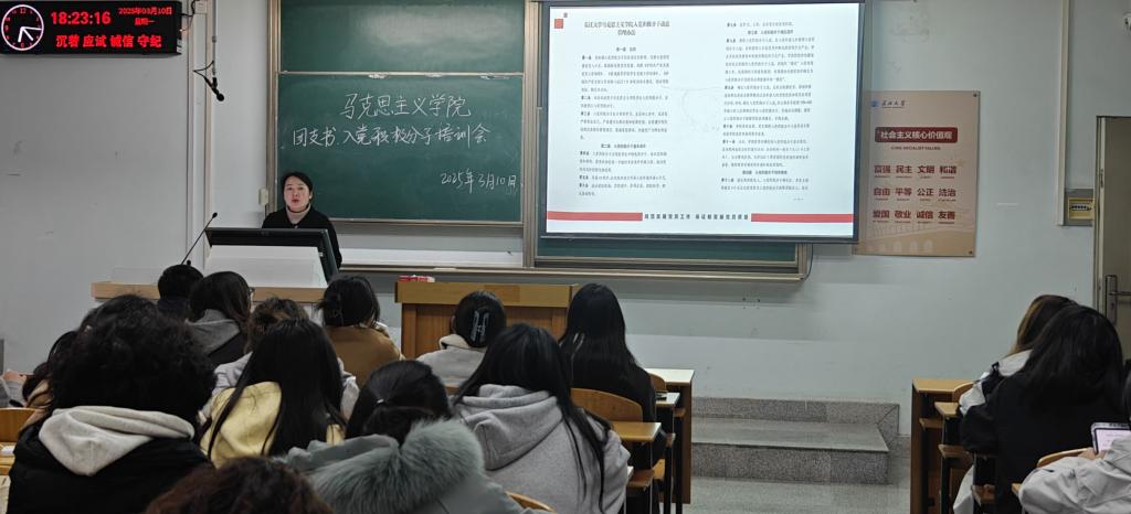 学院党建秘书兼本科生党支部书记张云雾面向全院各团支部书记、入党积极分子开展了集中宣传。她从入党积极分子应具备的条件、确定程序、培养考察、动态管理等方面进行了详细讲解,号召同学们端正入党动机、提高思想认识、勇于实践锻炼、强化担当意识,并就近期团员“推优”、毕业生党员发展工作进行了现场答疑。