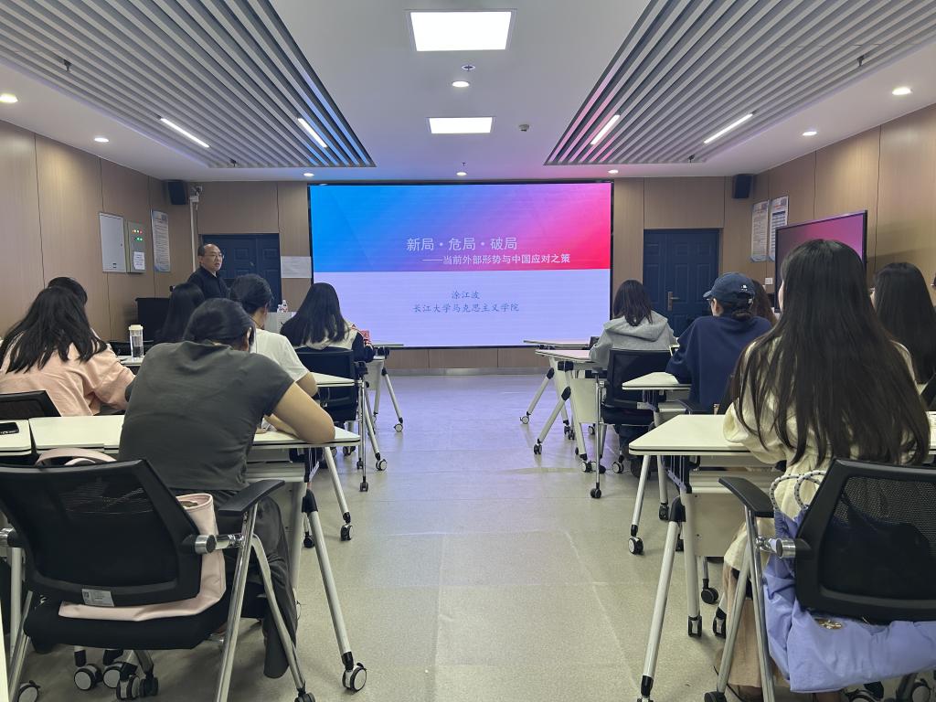 党课以《新局·危局·破局——当前外部形势与中国应对之策》为题展开。涂江波首先分析国际格局,指出“东升西降”趋势显著但“西强东弱”现实仍需正视,强调青年要胸怀忧患意识,以清醒认知应对百年变局中的风险挑战。在解析“危局”时,他结合“修昔底德陷阱”理论,深入剖析中美关系中的结构性矛盾,引导学员从历史与现实维度理解大国竞争的复杂性,树牢底线思维。面对“破局”路径,他强调,实现民族复兴需筑牢定力根基:既要在乱局中坚守道路自信,更要以自我革新精神锤炼过硬本领,方能在国际风云中稳立潮头。
