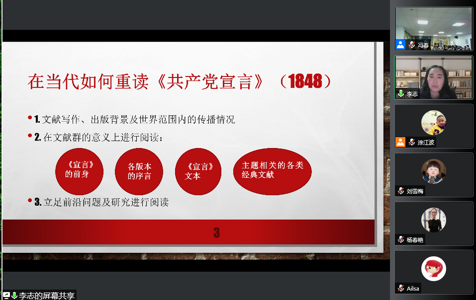 基于多年对《共产党宣言》的深入研究,李志教授首先从“为什么今天还要重读《共产党宣言》”开始谈起。她提出,无论是从唯物史观、危机理论、历史学、政治学、政治哲学,抑或是阶级理论等视野来看,《共产党宣言》这一文本都具有重要的研究价值。其次,她谈到了“在当代如何重读《共产党宣言》”,指出可以“基于文献写作、出版背景及世界范围内的传播情况进行”、“在文献群的意义上进行阅读”、“立足前沿问题及研究进行阅读”。第三,她围绕《共产党宣言》所暗含的一系列核心问题及其回应,展示了如何进行针对《共产党宣言》的文本阅读。