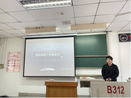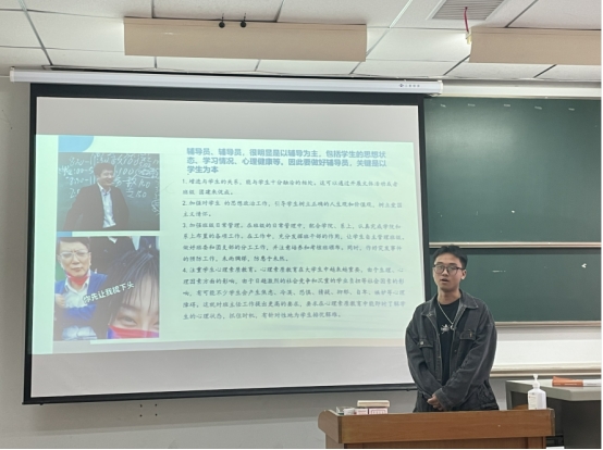 本堂课主要采用了学生自主分享模式,由思政12101班的魏宇豪,思政12102班的吴佳庆、李岱松三位同学为在座师生带来了精彩分享。魏宇豪的《论一个辅导员的自我修养》着重强调了作为老师的“爱与责任”,引起同学共鸣,吴佳庆的《辅导员养成攻略》主要从教师能力方面发表了自己的看法,李岱松的《假如我是一名辅导员》则较为全面地介绍了辅导员的日常工作。