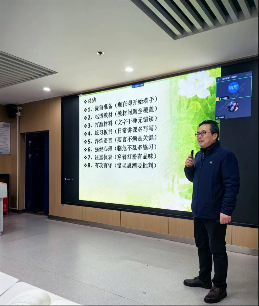 备课会第一项议程是聆听专家讲座。讲座主题为“思政课教学展示的新变化与新要求”,主讲人为华中科技大学黄岭峻教授。黄教授分享了近年来思政课教学展示活动优秀案例,详细讲解了比赛要求和注意事项,鼓励思政课教师学会融合课堂教学与教学比赛,努力做到教赛相长。