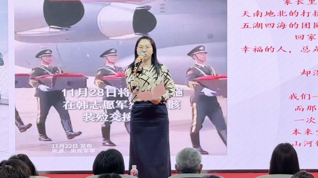 在炮火连天的岁月里,书信是表达情感的重要载体,也是真实滚烫的历史见证。课堂上,涂江波以红色书信为线,围绕人物生平、书信背景、书信内容展开,一一解读抗美援朝烈士康致中写给妻子高亚梅的多封战地家书,串起康致中参加革命、入朝作战、英勇牺牲的革命故事,并讲述志愿军后代康致中的儿子康明“漫漫数十载,踏遍寻父路”,历时70余年“寻找”父亲的动人故事。