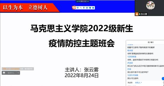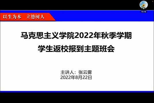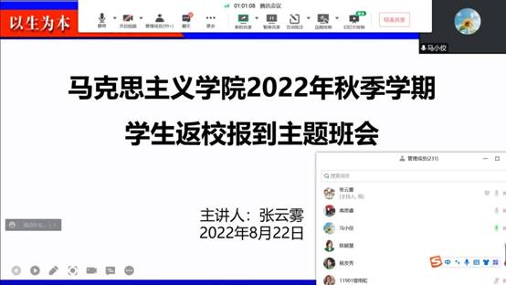 (通讯员:齐晓杭 摄影:龙薛西)为有序做好秋季返校报到工作,讲清疫情防控政策,vwin德赢AC米兰官网2022年秋季学期学生返校报到主题班会于8月22日-8月25日通过腾讯会议线上召开,辅导员张云雾老师、李敏老师分别面向本、研学生进行了宣讲,学院党委副书记马小佼线上参会。