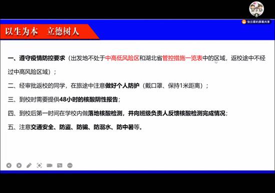 8月22日,张云雾老师和李敏老师分别召开了高年级返校主题班会。会议伊始,张老师为同学们详细解读秋季开学预通知,并对学生报到前的准备工作进行阐述。战“疫”时不我待,坚持就是胜利,张老师结合当前疫情形势带领同学们共同学习《新型冠状病毒肺炎防控方案(第九版)》,厘清高中低风险地区的概念与区别。而对于安全问题她强调:“在返校过程中,要遵守疫情防控要求,注意交通安全、防盗、防骗、防溺水、防中暑,要始终把安全作为头等大事。”李敏老师重点宣讲了研究生返校注意事项。