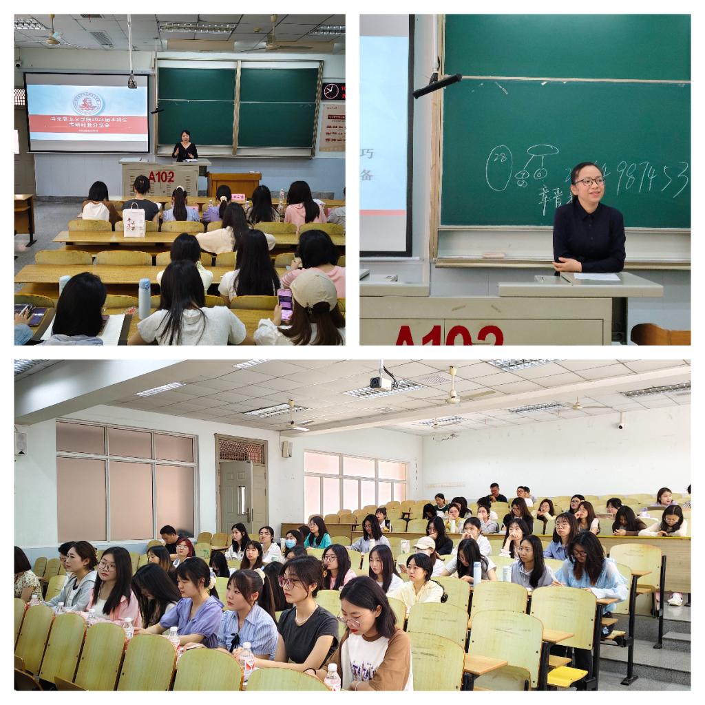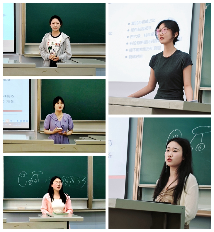 “选择大于努力”。经验分享会上,夏丽杰和王子怡两位同学就考研推免的相关准备及注意事项进行了详细的阐述。张欣玥和王巧同学就考研目标学校的选择进行了讲解,分析了不同学校、专业的特点与优势。杨书惠和潘霞同学分享了考研复习进度安排,分享了复习方法和策略。周文笛和吴菁菁同学则就政治、英语和专业课的学习方法进行了精彩的讲解,她们结合真题案例,深入剖析了各科目的重点难点。熊虹吉和吴宝欣同学分享了考研心态调整及复试准备的过程,强调了保持积极心态的重要性。