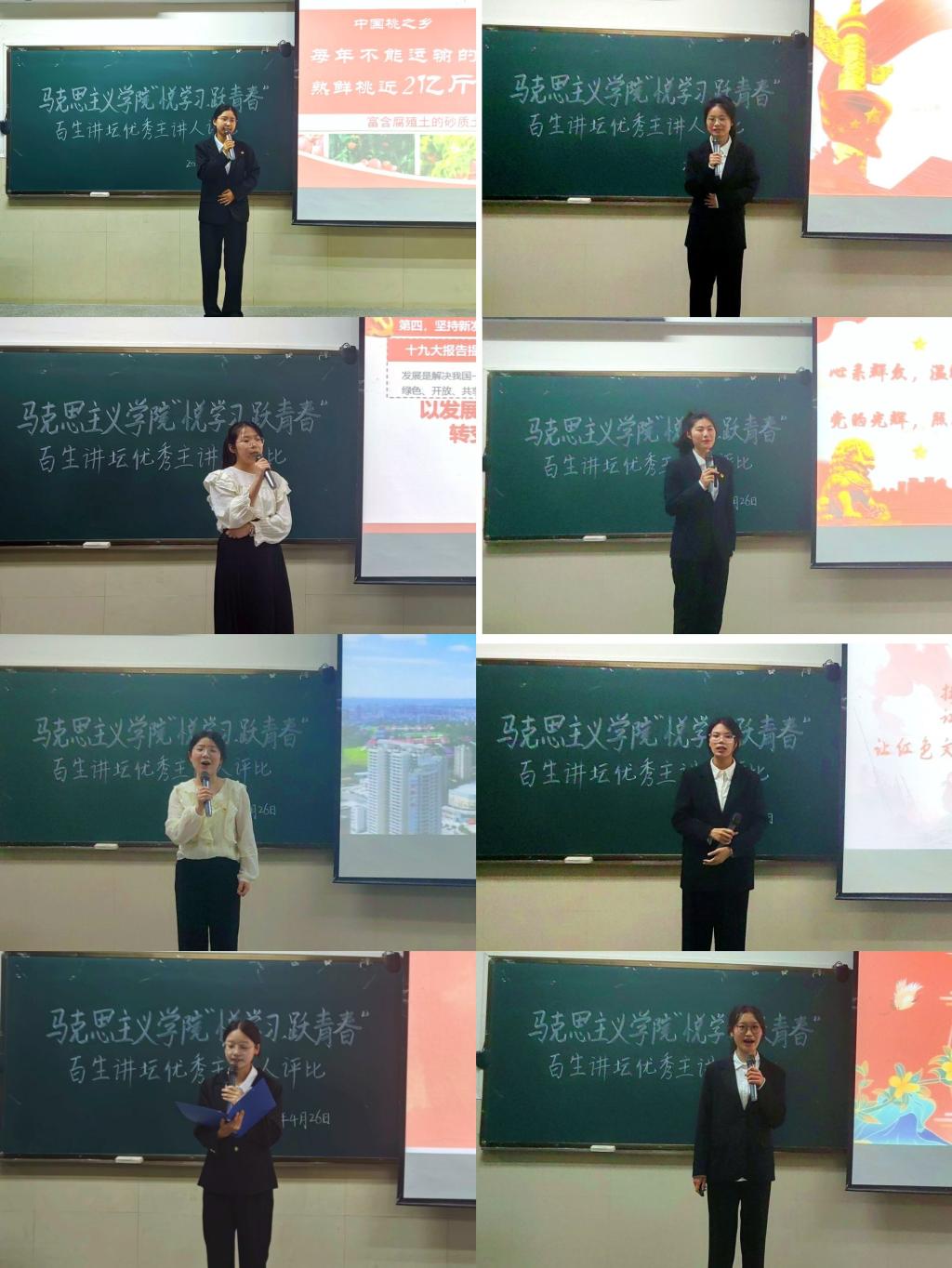 “青年一代有理想、有担当,国家就有前途,民族就有希望。”“我暗下决心,以后要尽最大努力为家乡发展作贡献。”比赛中,8位参赛选手依次上台,以情绪饱满、慷慨激昂的演讲,阐述对习近平新时代中国特色社会主义思想的学习感悟与实践心得。吴宇洁、秦雯婧、晏婉怡等同学结合自身成长经历和家乡变化发展,表达了投身乡村振兴、助力家乡建设的真诚心愿,展现了青年一代的理想担当;咸懿芸和曾晓慧等同学带领大家聆听革命故事、汲取青春力量,从陈毅安等革命先烈为国捐躯的事迹讲述中,表达了对先辈热血奋斗的敬仰和国家繁荣富强的自豪。