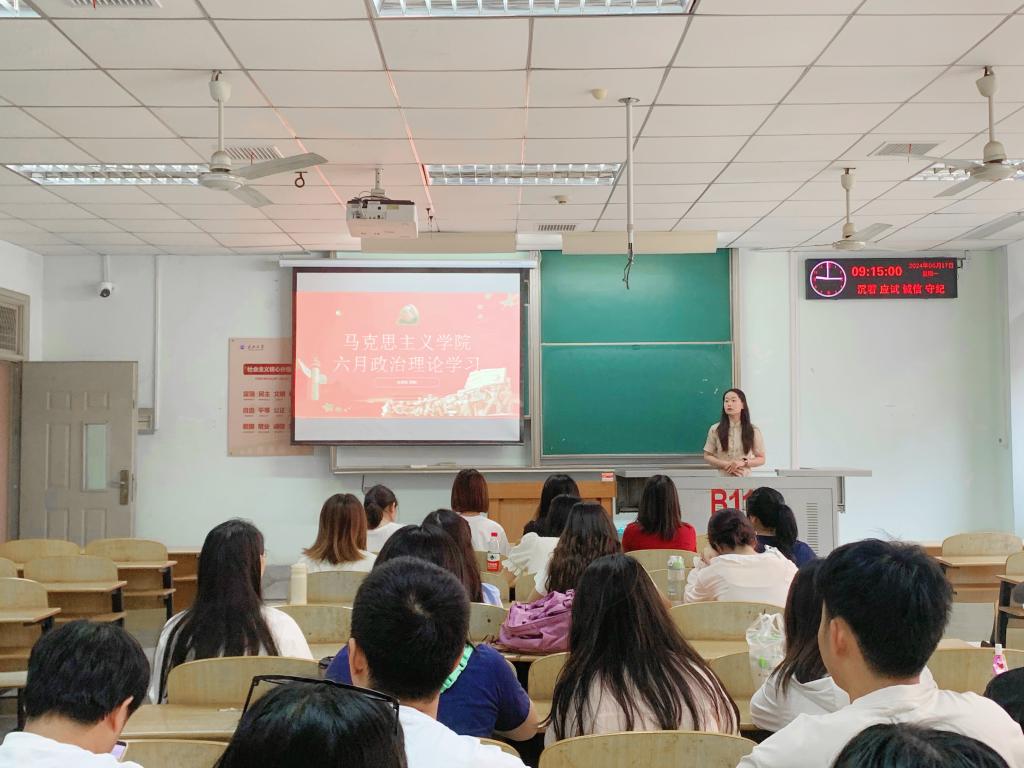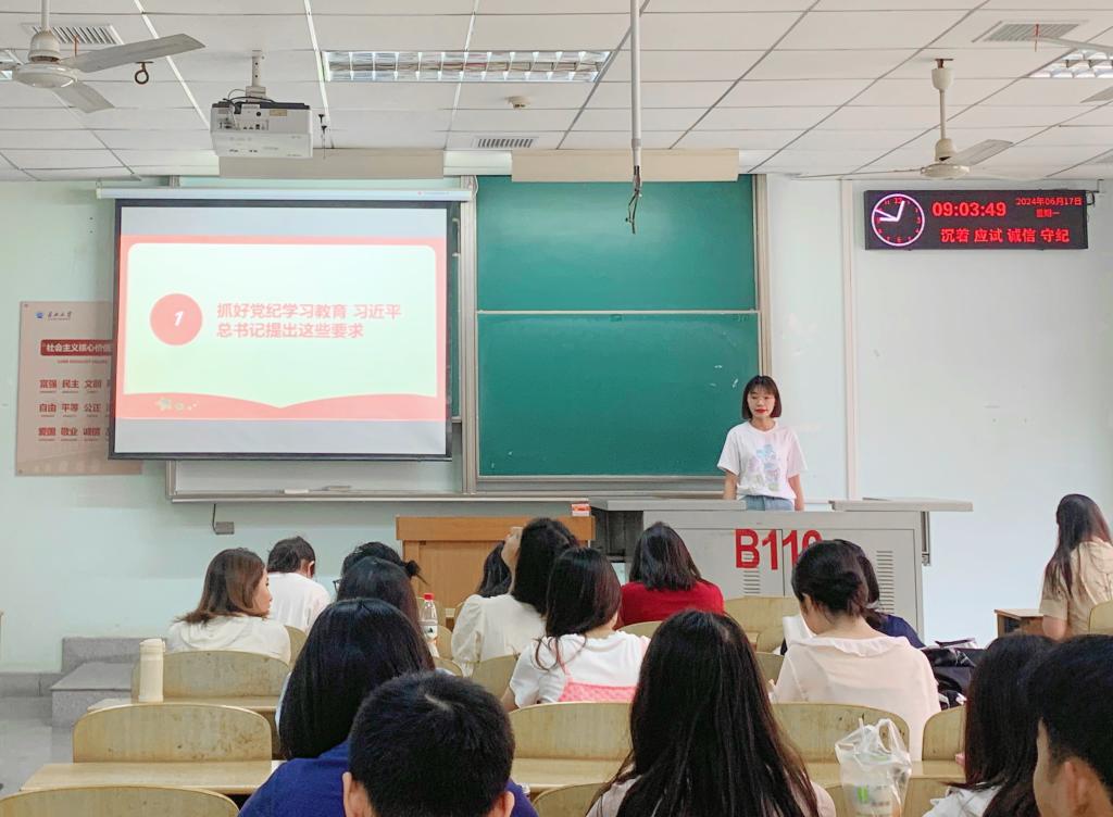 2023级学硕班学生黎娟领学习近平总书记关于党纪学习教育的重要讲话精神,以播放视频方式引导同学们认识党纪学习教育的“三个必须把握”:一是必须把握党纪学习教育的重要意义;二是必须把握开展党纪学习教育的目标要求;三是必须把握党纪学习教育的学习方法。