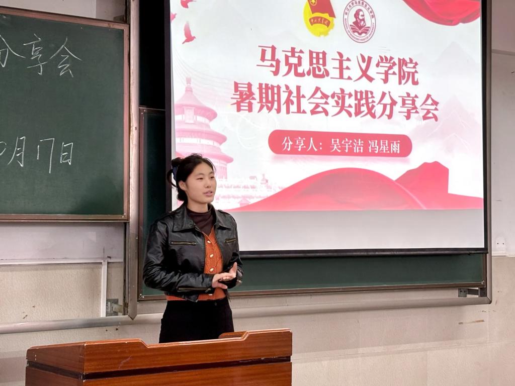 分享会上,吴宇洁首先介绍了自己参与的多项暑期社会实践:学院“信·荆楚”团队赴攀枝花、成都、重庆开展“寻信解信”活动;第十九期校青马班的湖南红色研学行;2025年全国大学生暑期社会实践专项行动。她还结合自身,分享了理论宣讲、制作团课、体验红军生活等经历的意义,鼓励学弟学妹主动参与社会实践,将专业素养与实践结合,明确自身定位,勇担新时代青年责任。