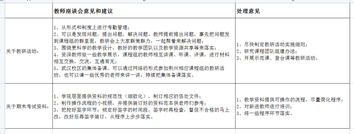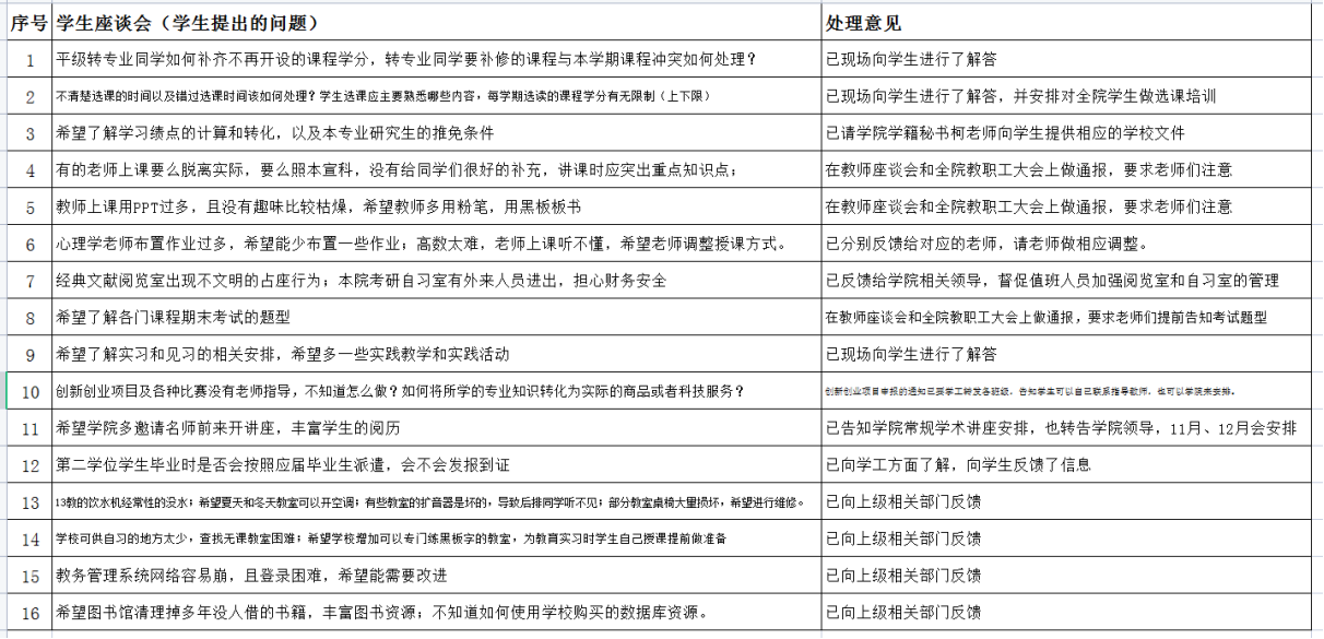 认真组织教师和学生座谈会,听取参会代表所搜集到的教学管理方面的意见和建议,两个座谈会均由教学院长助理李振华老师主持,会后学院对师生反映的问题和建议进行了分析、反馈,并提出了相应的整改措施具体情况见后面的附件1和附件2.