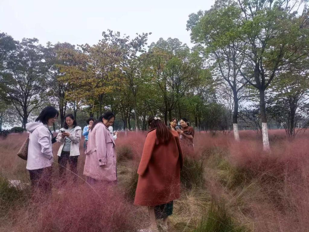行程中,一片如梦似幻的粉黛乱子草花海成为了活动的焦点。这片如烟似霞的粉色云雾,瞬间点燃了老师们的兴致。大家纷纷驻足,拿出手机,在这片浪漫的粉色背景中留下了一张张灿烂的笑脸,定格了秋日里最温馨动人的瞬间。