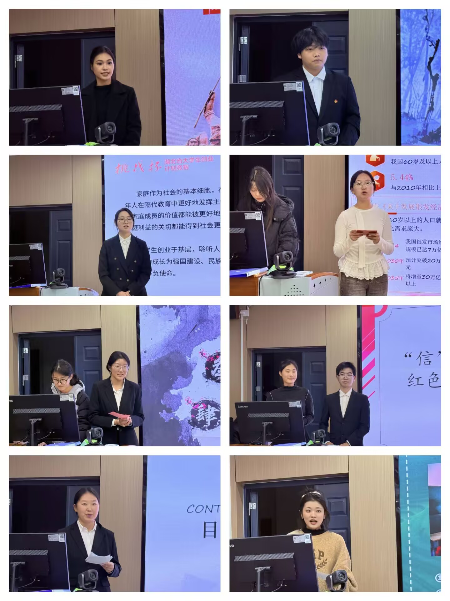 比赛现场氛围热烈,八支参赛团队依次登台,围绕项目背景、实践调研、核心优势、落地运营及未来规划等维度展开汇报展示。各团队立足专业所学回应社会现实,充分彰显良好的创新意识与扎实的实践能力。多数项目深耕荆楚文化沃土,深入挖掘其时代价值,积极探索文化资源与现代商业的融合路径,清晰展现出以文创产业助力区域发展的鲜明思路。
